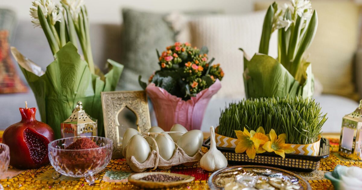A vibrant arrangement of Nowruz haft-seen elements featuring greenery, flowers, and traditional items.