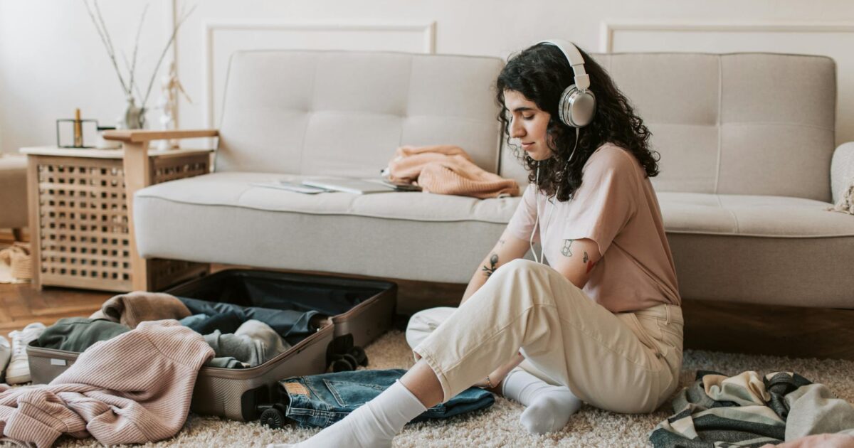 Young woman with headphones packing suitcase in a cozy living room.
