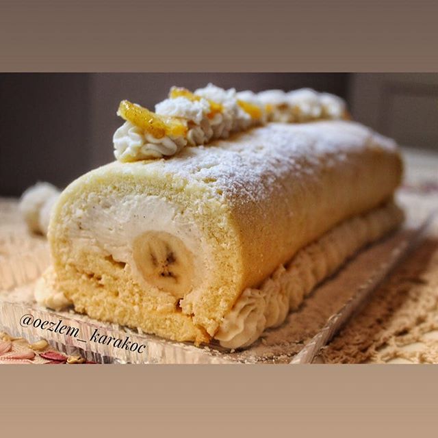 موزها را در قسمت کناری کیک و در کنار هم بچینید با دقت رول کنید. و بصورت دلخواه تزئین کنید!
