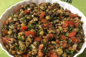 آموزش طرز تهیه سالاد زیتون . با این آموزش آشپزی در هفت گنج همراه باشید. مواد لازم: 1 کاسه بزرگ زیتون سبز 1 عدد پیاز کوچک و یا 5_4 ساقه پیازچه یک مشت جعفری خرد...