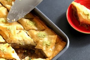 آموزش طرز تهیه دسر باقلوا . با این آموزش آشپزی در هفت گنج همراه باشید. مواد مورد نیاز: کره ۲۵۰ گرم خمیر فیلو ۲۰۰ گرم پسته ۲۰۰ گرم گردو ۲۰۰ گرم شکر ۱ پیمانه آب...