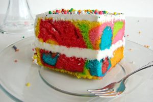 آموزش طرز تهیه کیک رنگین کمانی . با این آموزش آشپزی در هفت گنج همراه باشید. مواد مورد نیاز: خمیر کیک زرد و سفید رنگ غذا خامه گراوند برای تزئین گام اول خمیر کیک...